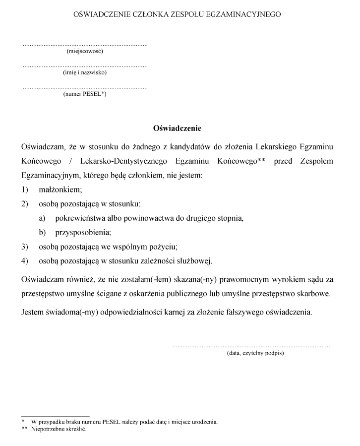 WZÓR - OŚWIADCZENIE CZŁONKA ZESPOŁU EGZAMINACYJNEGO