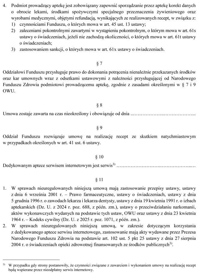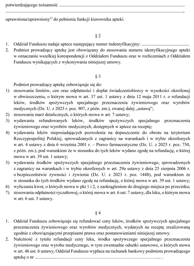 § 2.[Ramowy wzór umowy] Ustala się ramowy wzór umowy na wydawanie refundowanego leku, środka spożywczego specjalnego przeznaczenia żywieniowego oraz wyrobu medycznego na receptę, stanowiący załącznik nr 2 do rozporządzenia.