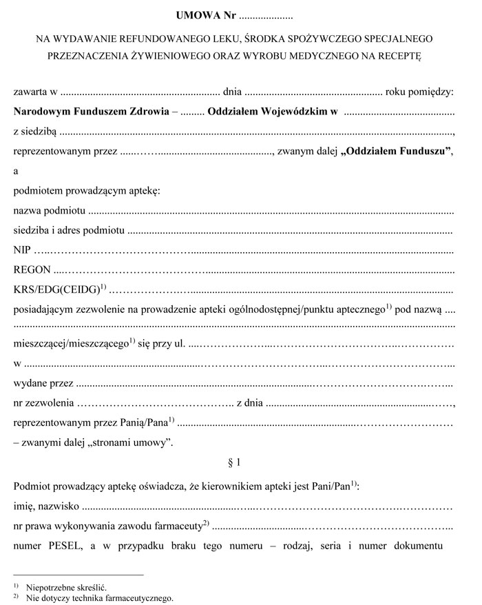 § 1. 1. Przedmiotem umowy na wydawanie refundowanego leku, środka spożywczego specjalnego przeznaczenia żywieniowego oraz wyrobu medycznego na receptę, zwanej dalej „umową na realizację recept”, są: