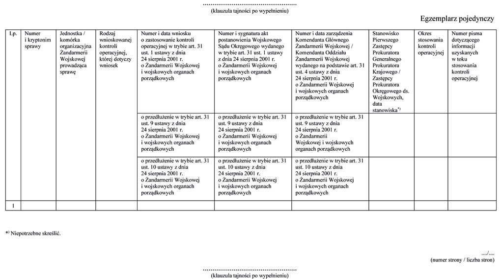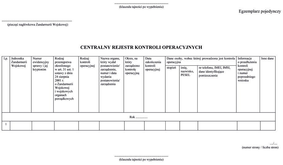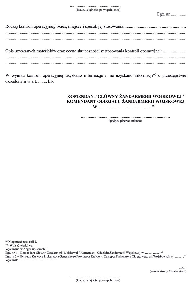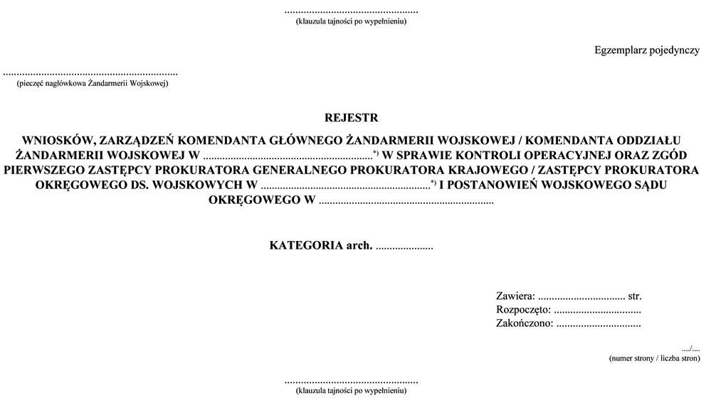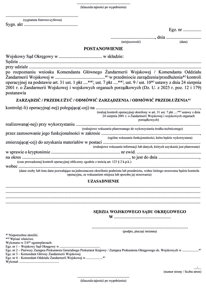 „2a) postanowienia Wojskowego Sądu Okręgowego o zarządzeniu kontroli operacyjnej lub odmowie zarządzenia kontroli operacyjnej, lub przedłużeniu kontroli operacyjnej, lub odmowie przedłużenia kontroli operacyjnej jest określony w załączniku nr 2a do rozporządzenia;