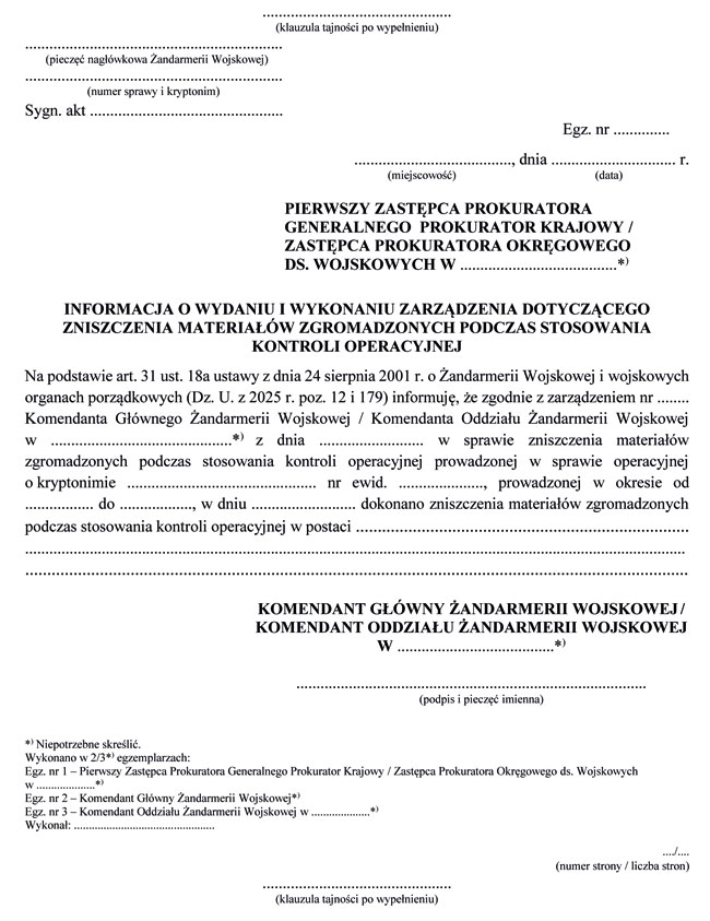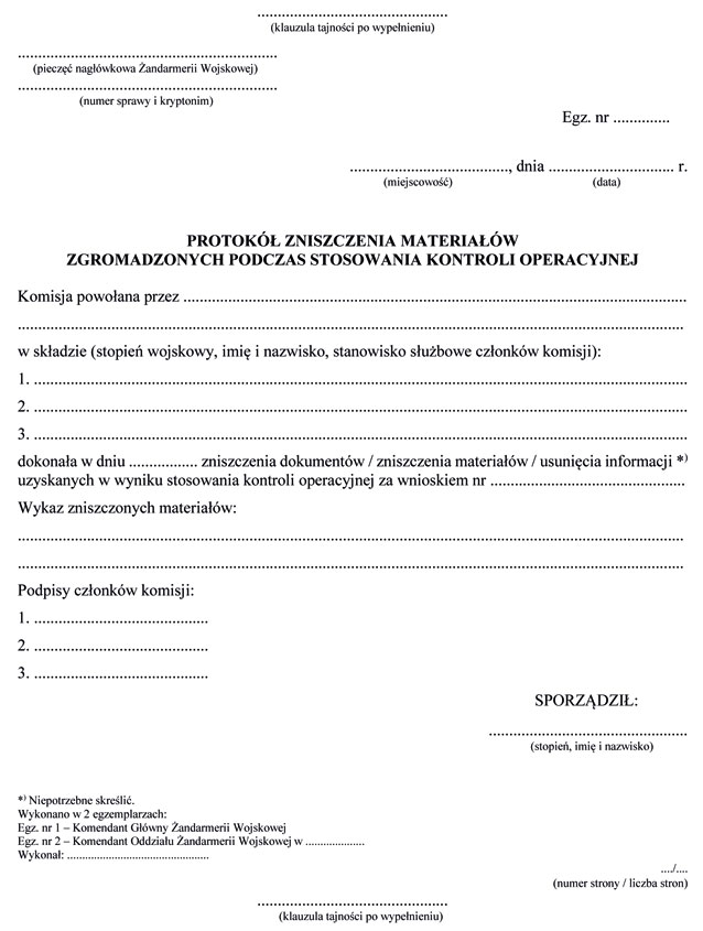 WZÓR - PROTOKÓŁ ZNISZCZENIA MATERIAŁÓW ZGROMADZONYCH PODCZAS STOSOWANIA KONTROLI OPERACYJNEJ