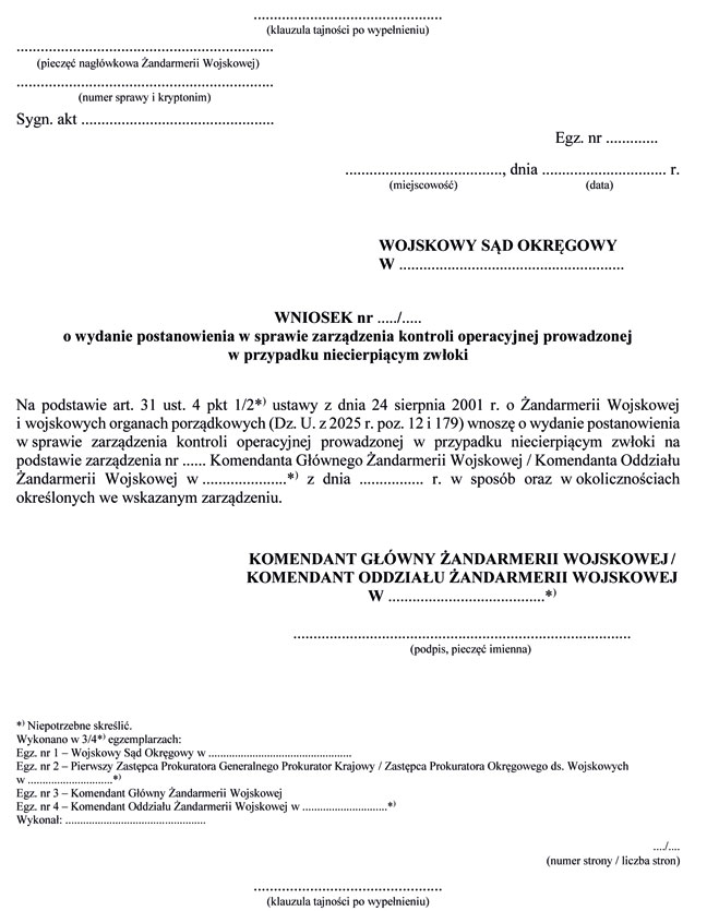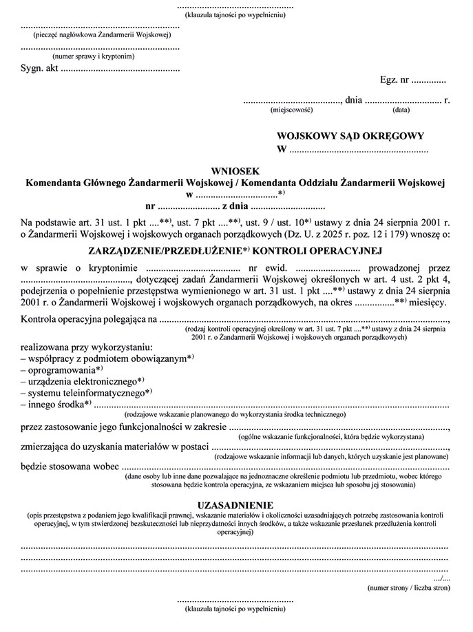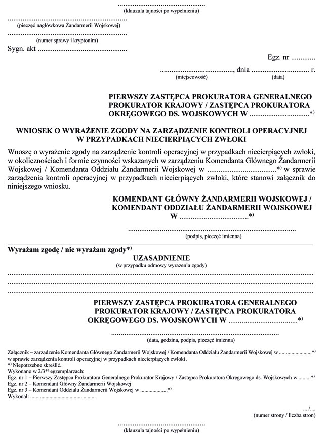 2b) wniosku Komendanta Głównego Żandarmerii Wojskowej lub komendanta oddziału Żandarmerii Wojskowej kierowanego do Wojskowego Sądu Okręgowego o wydanie postanowienia w sprawie zarządzenia kontroli operacyjnej prowadzonej w przypadku niecierpiącym zwłoki jest określony w załączniku nr 2b do rozporządzenia;”;