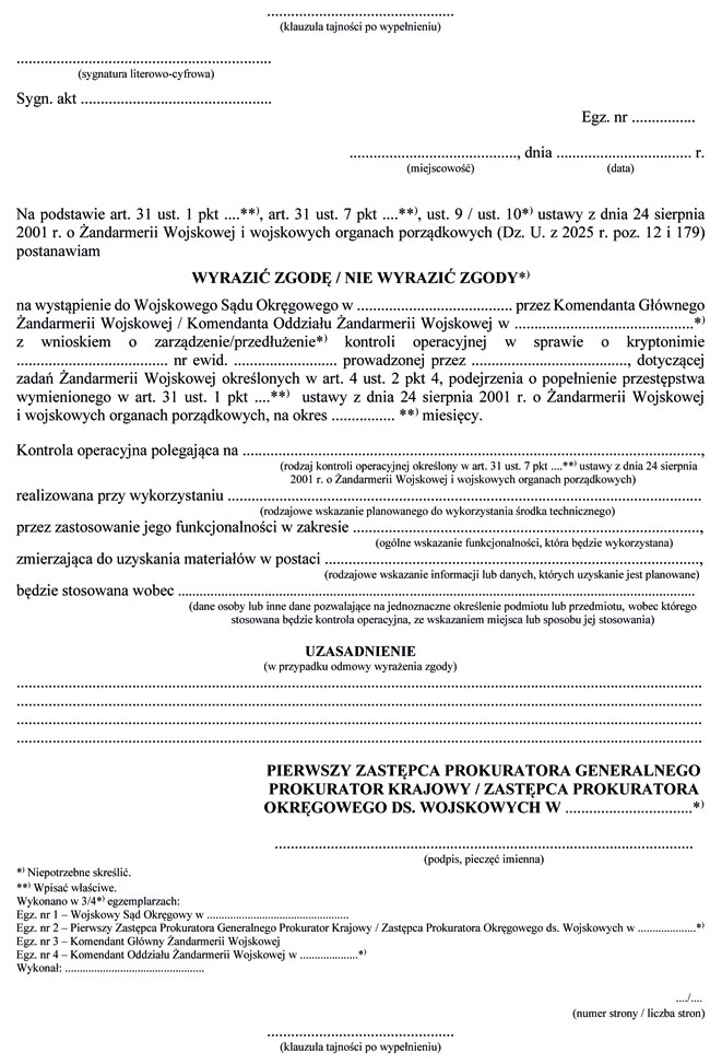 WZÓR - WNIOSEK O WYRAŻENIE ZGODY NA ZARZĄDZENIE KONTROLI OPERACYJNEJ W PRZYPADKACH NIECIERPIĄCYCH ZWŁOKI