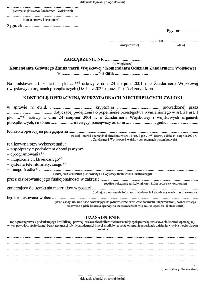 Na podstawie art. 31 ust. 20 ustawy z dnia 24 sierpnia 2001 r. o Żandarmerii Wojskowej i wojskowych organach porządkowych (Dz. U. z 2025 r. poz. 12 i 179) zarządza się, co następuje: