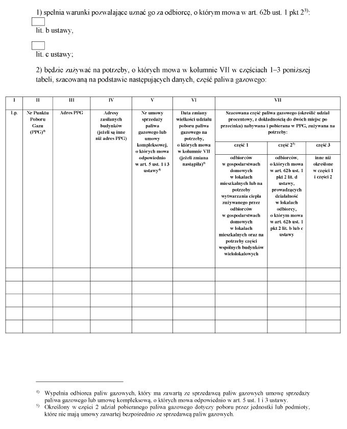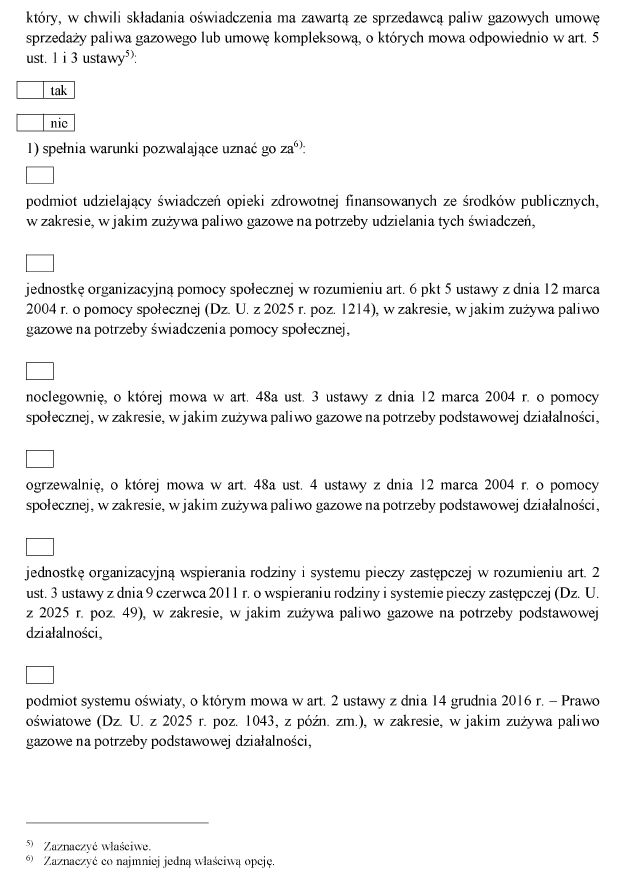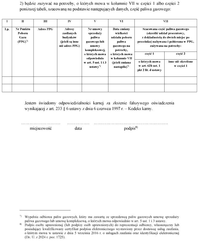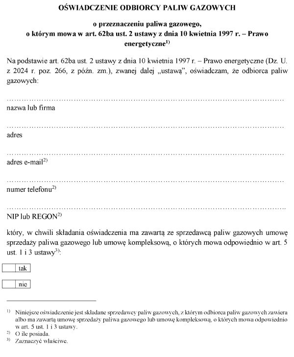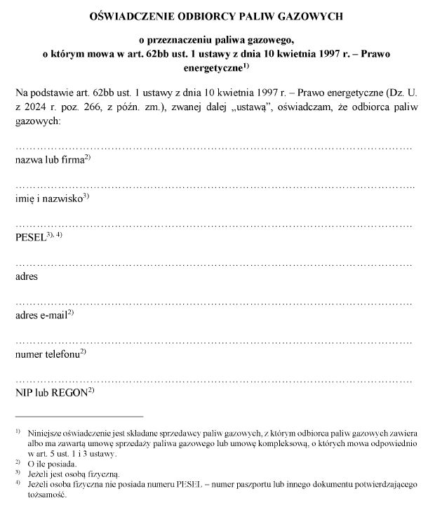 w sprawie wzorów oświadczeń składanych przez odbiorców paliw gazowych o przeznaczeniu paliwa gazowego w celu skorzystania ze szczególnych rozwiązań w związku z sytuacją na rynku gazu