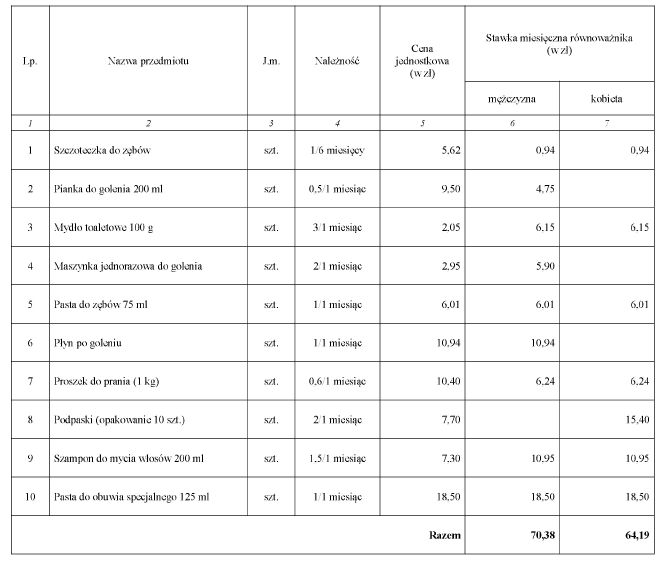 1) środki do utrzymania higieny osobistej oraz konserwacji obuwia - od pierwszego dnia służby, a następnie za każdy rozpoczęty miesiąc kalendarzowy;