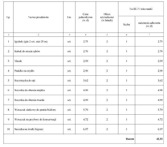 2) przybory do utrzymania higieny osobistej oraz konserwacji obuwia - od pierwszego dnia służby, a następnie na III i V roku nauki.