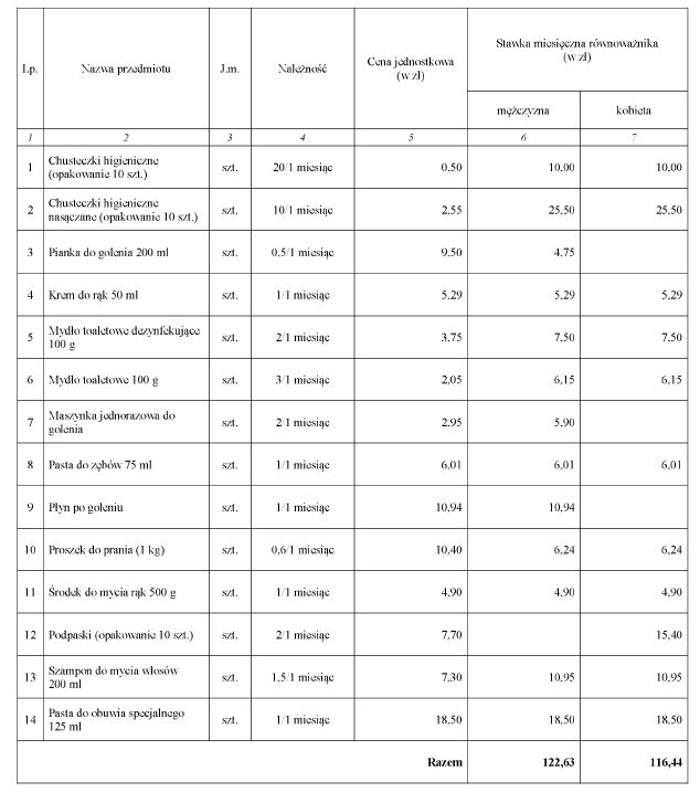 1) środki do utrzymania higieny osobistej oraz konserwacji obuwia - od pierwszego dnia służby poza granicami państwa, a następnie za każdy rozpoczęty miesiąc kalendarzowy;