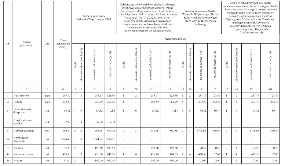 § 6. [Wypłacanie równoważnika żołnierzowi Jednostki Wojskowej Nr 2305] 1. Żołnierzowi Jednostki Wojskowej Nr 2305 wykonującemu zadania ochrony VIP, któremu nie wydano w naturze należnych przedmiotów umundurowania i wyekwipowania określonych w wierszach oznaczonych lp. 25, 30, 37 i 47 w zestawie nr 27 w załączniku nr 1 do rozporządzenia wydanego na podstawie art. 334 ust. 4 pkt 1 ustawy z dnia 11 marca 2022 r. o obronie Ojczyzny, wypłaca się równoważnik.