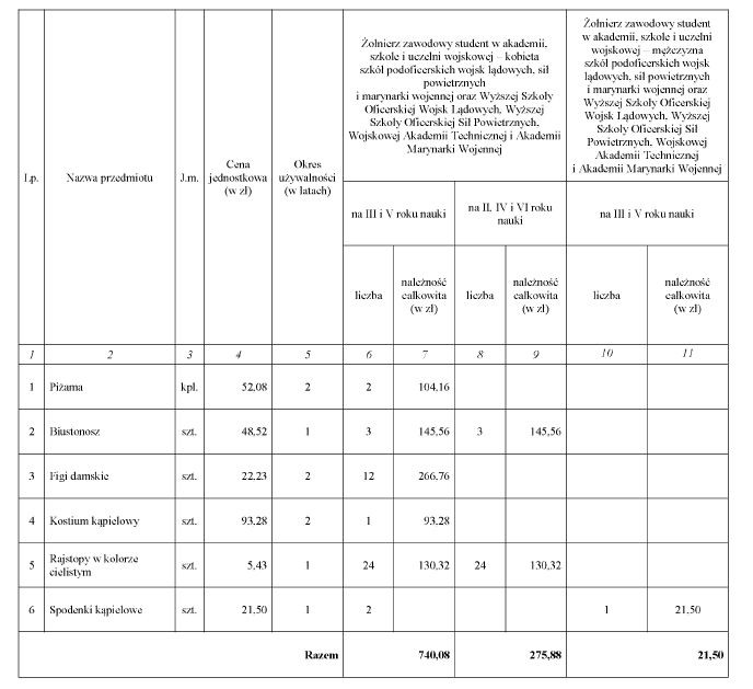 WYSOKOŚĆ RÓWNOWAŻNIKA DLA ŻOŁNIERZA STUDENTA W AKADEMII, SZKOLE I UCZELNI WOJSKOWEJ ZA PRZEDMIOTY UMUNDUROWANIA I WYEKWIPOWANIA NIEWYDANE W NATURZE