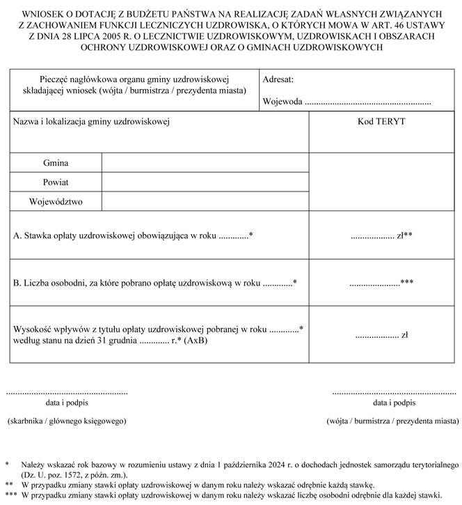 WZÓR - WNIOSEK O DOTACJĘ Z BUDŻETU PAŃSTWA NA REALIZACJĘ ZADAŃ WŁASNYCH ZWIĄZANYCH Z ZACHOWANIEM FUNKCJI LECZNICZYCH UZDROWISKA, O KTÓRYCH MOWA W ART. 46 USTAWY Z DNIA 28 LIPCA 2005 R. O LECZNICTWIE UZDROWISKOWYM, UZDROWISKACH I OBSZARACH OCHRONY UZDROWISKOWEJ ORAZ O GMINACH UZDROWISKOWYCH