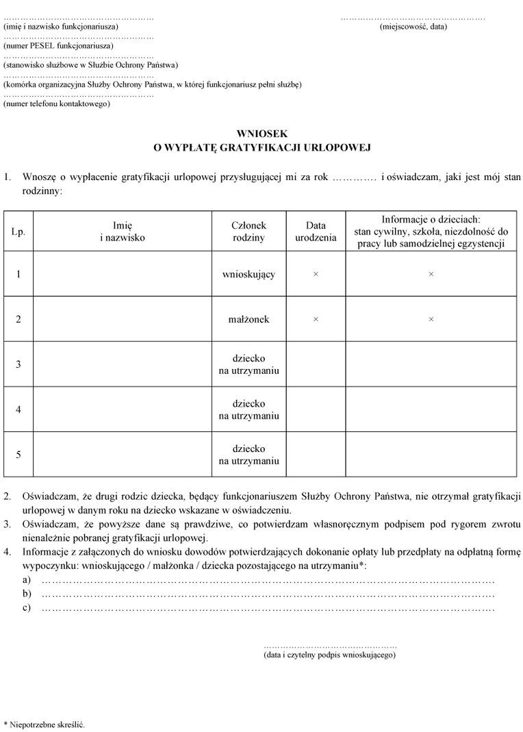 § 2.[Wniosek o wypłatę gratyfikacji urlopowej] Gratyfikację urlopową wypłaca się na pisemny wniosek, o którym mowa w art. 152a ust. 6 ustawy z dnia 8 grudnia 2017 r. o Służbie Ochrony Państwa, złożony przez funkcjonariusza lub osobę uprawnioną, o której mowa w art. 152a ust. 10 tej ustawy.