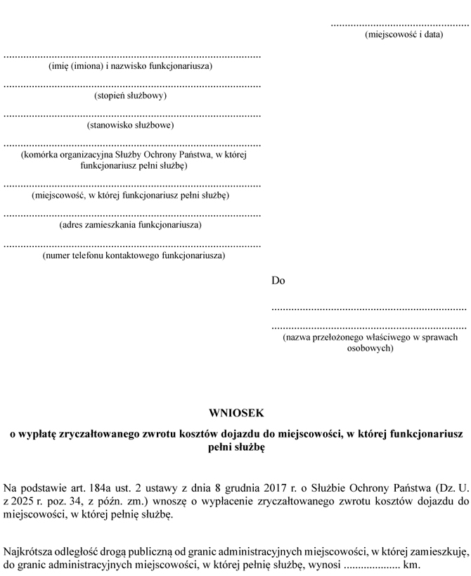 WZÓR - WNIOSEK O WYPŁATĘ ZRYCZAŁTOWANEGO ZWROTU KOSZTÓW DOJAZDU DO MIEJSCOWOŚCI, W KTÓREJ FUNKCJONARIUSZ PEŁNI SŁUŻBĘ