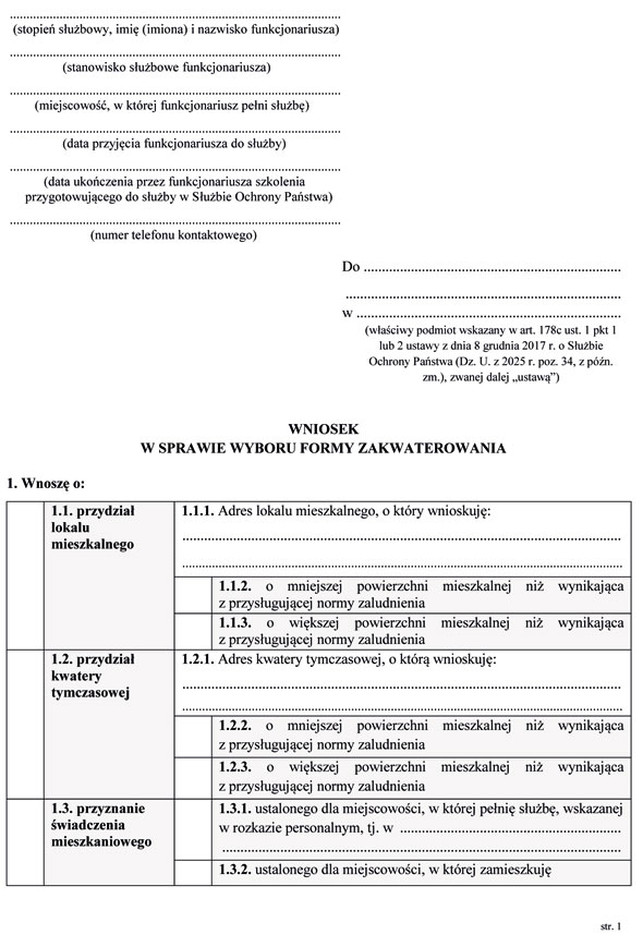 1) wzór wniosku w sprawie wyboru formy zakwaterowania, o którym mowa w art. 178a ust. 5 ustawy z dnia 8 grudnia 2017 r. o Służbie Ochrony Państwa, zwanej dalej „ustawą”;