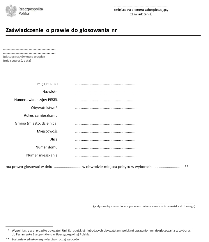 2. W upoważnieniu do odbioru zaświadczenia wskazuje się: imię (imiona) i nazwisko, datę urodzenia oraz numer ewidencyjny PESEL wyborcy będącego obywatelem polskim, a w przypadku wyborcy będącego obywatelem Unii Europejskiej i nieposiadającego obywatelstwa polskiego – numer paszportu albo nazwę i numer innego dokumentu stwierdzającego tożsamość oraz dane: imię, nazwisko, numer i serię ważnego dokumentu tożsamości osoby upoważnianej.