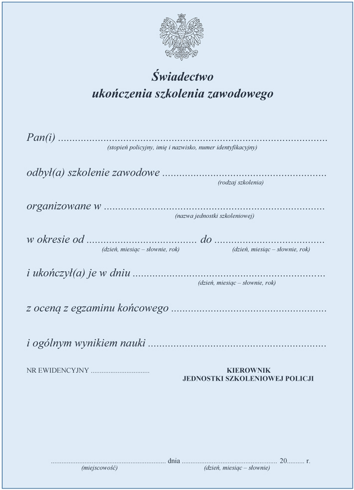 WZÓR - ŚWIADECTWO UKOŃCZENIA SZKOLENIA DLA POLICJANTÓW W SŁUŻBIE KANDYDACKIEJ
