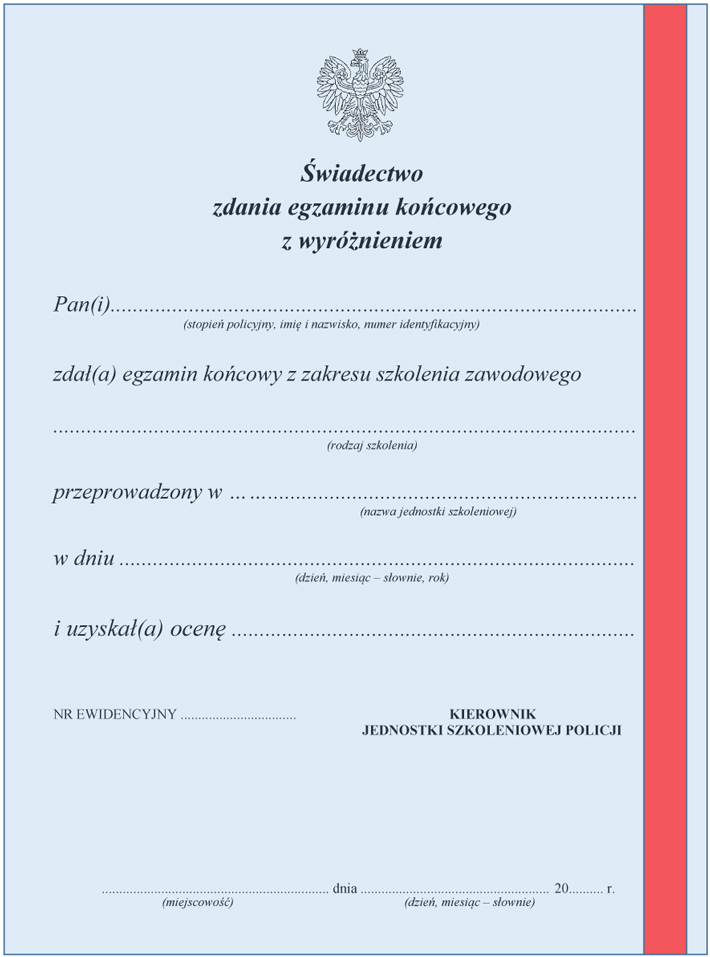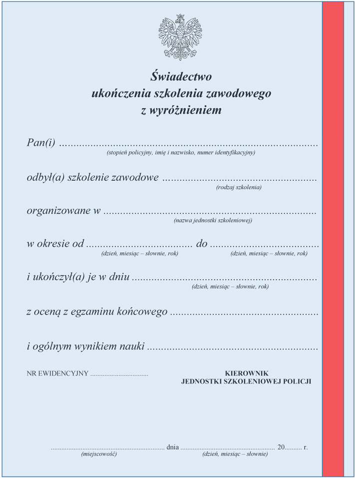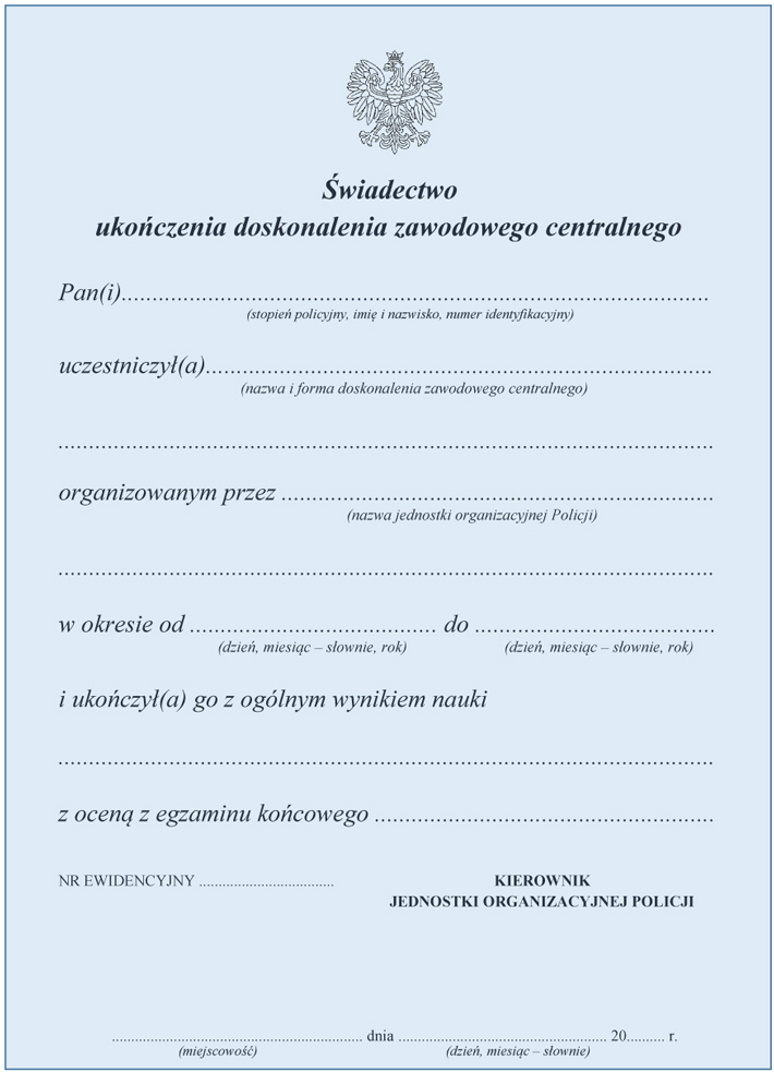 8) wzory świadectwa ukończenia szkolenia zawodowego, świadectwa ukończenia szkolenia zawodowego z wyróżnieniem, świadectwa zdania egzaminu końcowego, świadectwa zdania egzaminu końcowego z wyróżnieniem, świadectwa ukończenia szkolenia dla policjantów w służbie kandydackiej, świadectwa ukończenia szkolenia dla policjantów w służbie kontraktowej oraz świadectwa ukończenia doskonalenia zawodowego centralnego.
