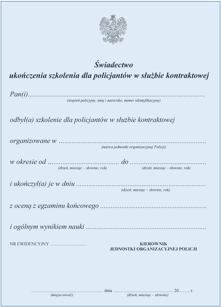 WZÓR - ŚWIADECTWO UKOŃCZENIA SZKOLENIA DLA POLICJANTÓW W SŁUŻBIE KONTRAKTOWEJ