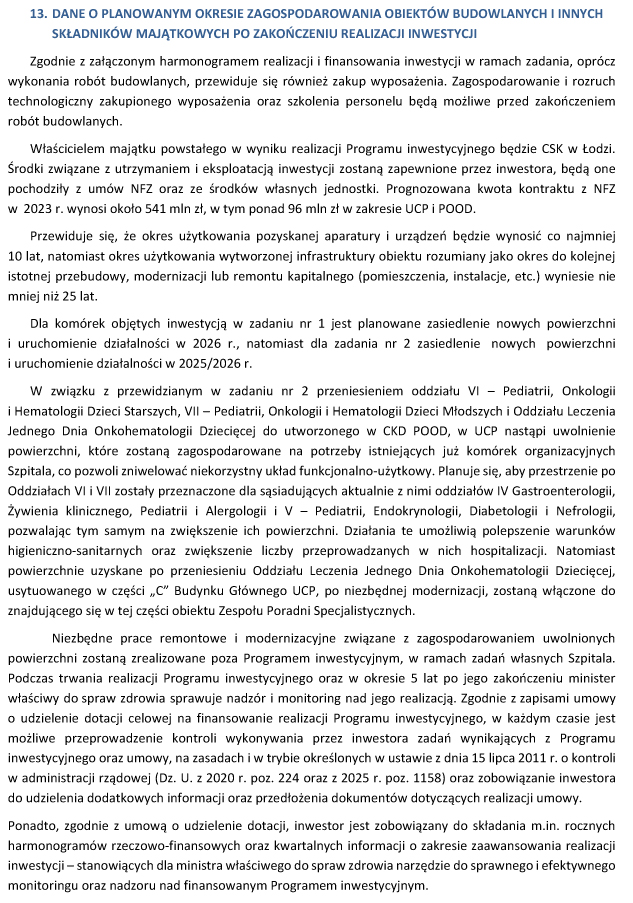 c) rozdział 13 „Dane o planowanym okresie zagospodarowania obiektów budowlanych i innych składników majątkowych po zakończeniu realizacji inwestycji” otrzymuje brzmienie określone w załączniku nr 3 do niniejszej uchwały.