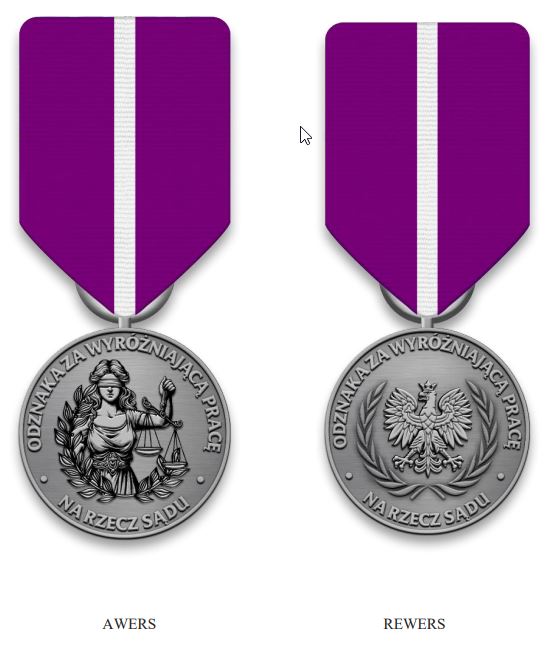 § 4. 1. Odznaka ma formę okrągłego medalu o średnicy 35 mm, wykonanego z metalu w kolorze srebrnym, patynowanego, z wyraźnie zaznaczoną krawędzią po obu stronach. Medal posiada uszko i kółko do zawieszenia na wstążce. Awers medalu przedstawia klasyczne wyobrażenie Temidy - kobiety z zasłoniętymi oczami, trzymającej wagę. Postać otacza gałązka laurowa, symbolizująca zwycięstwo i zasługi. Wzdłuż krawędzi znajduje się wypukły napis: „ODZNAKA ZA WYRÓŻNIAJĄCĄ PRACĘ NA RZECZ SĄDU”. Rewers medalu zawiera godło Rzeczypospolitej Polskiej - orła białego w koronie. Wzdłuż krawędzi umieszczono wypukły napis: „ODZNAKA ZA WYRÓŻNIAJĄCĄ PRACĘ NA RZECZ SĄDU”. Wstążka wykonana jest z rypsu, o szerokości 35 mm, w kolorze fioletowym z wąskim białym paskiem biegnącym pionowo przez środek.