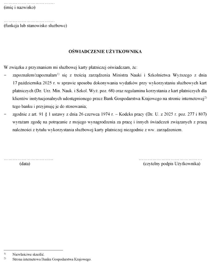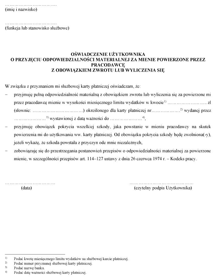 1) oświadczenia o zapoznaniu się z treścią niniejszego zarządzenia oraz ustalonego przez bank regulaminu korzystania z kart płatniczych i przyjęciu ich do stosowania oraz o wyrażeniu zgody na potrącanie z wynagrodzenia za pracę i innych świadczeń związanych z pracą należności z tytułu wykorzystania karty niezgodnie z zarządzeniem i ustalonym przez bank regulaminem korzystania z kart płatniczych, którego wzór jest określony w załączniku nr 2 do zarządzenia;