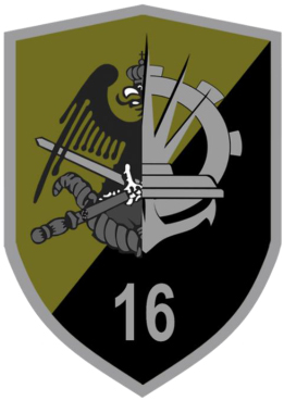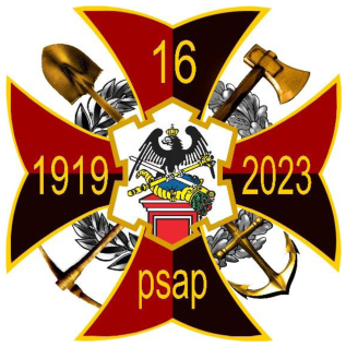 2. Odznaka, o wymiarach 40x40 mm, ma kształt krzyża maltańskiego ze złotym obramowaniem. Ramiona krzyża są podzielone w słup na dwa pola barwy czerwonej i czarnej. Użyte kolory nawiązują do historycznych barw saperów z okresu II Rzeczypospolitej. Pośrodku odznaki umieszczono tarczę o zarysie murów twierdzy ze złotym obramowaniem. Na białym polu tarczy znajduje się wizerunek czarnego orła w złotej koronie, trzymającego berło skrzyżowane z mieczem, oparte na niebieskiej poduszce wyłożonej na rogu obfitości wypełnionym kwiatami, wspartym na czerwonym postumencie, będący elementem herbu miasta Orzysza - miejsca stacjonowania 16 psap. Na górnym ramieniu krzyża znajduje się złota liczba „16”. Na dolnym ramieniu krzyża umieszczono złote litery „psap”. Użyte elementy stanowią skrót nazwy 16 psap. Na lewym ramieniu krzyża znajduje się złota liczba „1919” - data sformowania 1. Batalionu Saperów Wielkopolskich, którego tradycje dziedziczy 16 psap. Na prawym ramieniu krzyża umieszczono złotą liczbę „2023” - datę powstania 16 psap. Pomiędzy ramionami krzyża, na tle srebrnego wieńca laurowo-dębowego, symbolizującego zwycięstwo i męstwo, znajdują się brązowozłote wizerunki historycznych narzędzi inżynieryjno-saperskich: łopaty, topora, kotwicy i kilofa. Użyte elementy nawiązują do specyfiki zadań 16 psap.