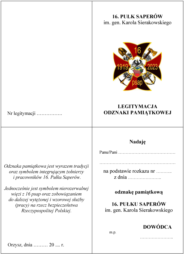 WZÓR LEGITYMACJI ODZNAKI PAMIĄTKOWEJ 16. PUŁKU SAPERÓW IM. GEN. KAROLA SIERAKOWSKIEGO