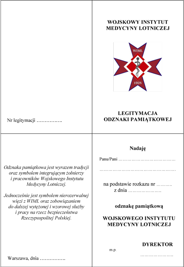 WZÓR LEGITYMACJI ODZNAKI PAMIĄTKOWEJ WOJSKOWEGO INSTYTUTU MEDYCYNY LOTNICZEJ