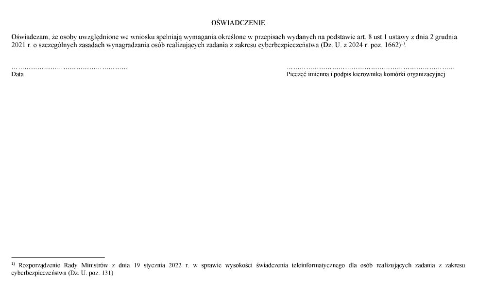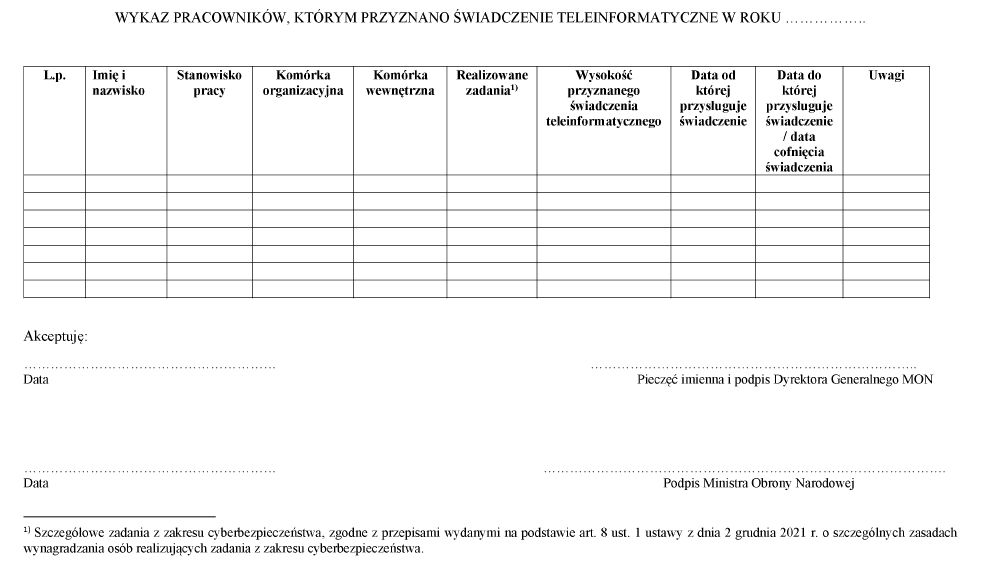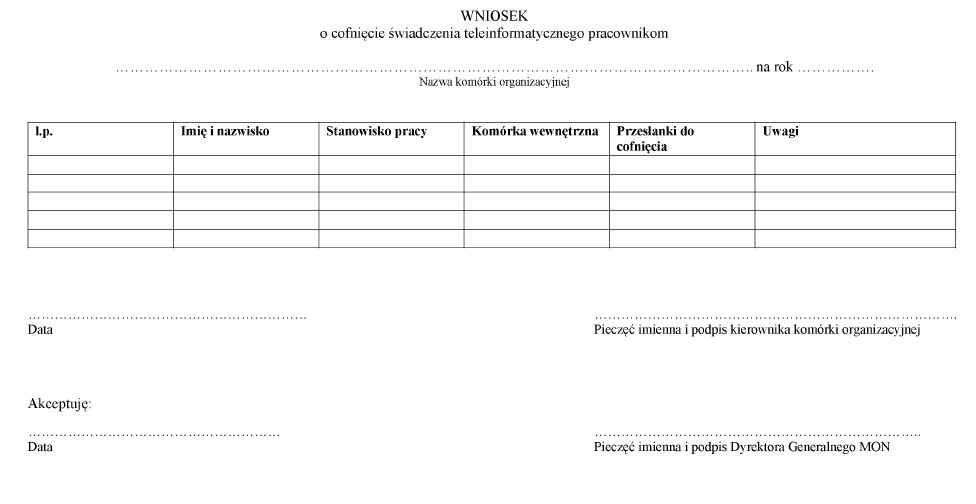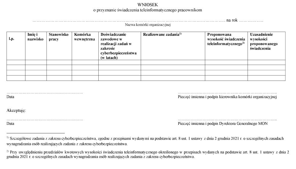 2) sporządza i przekazuje corocznie w terminie do dnia 31 lipca do Dyrektora Generalnego Ministerstwa Obrony Narodowej wniosek o przyznanie świadczenia teleinformatycznego dla podległych pracowników, dołączając oświadczenie o spełnieniu przez osoby wskazane we wniosku wymagań, o których mowa w pkt 1, zgodnie z wzorem określonym w załączniku nr 1;