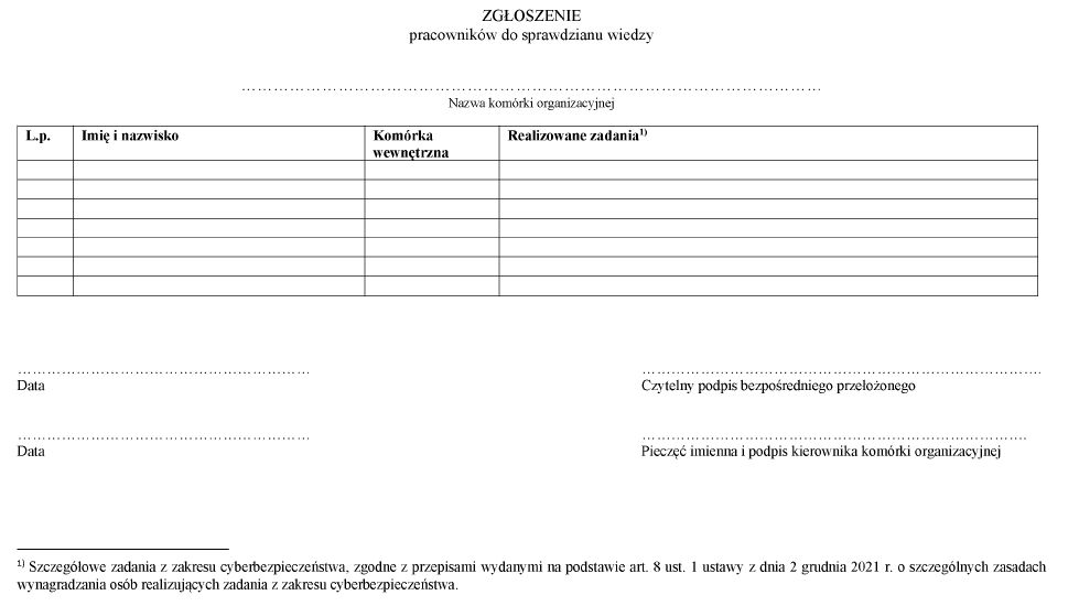 7. Pracownik przystępuje do sprawdzianu wiedzy na podstawie zgłoszenia bezpośredniego przełożonego zatwierdzonego przez kierownika komórki organizacyjnej, w której realizuje zadania, zgodnego z wzorem określonym w załączniku nr 3, z zastrzeżeniem § 6 ust. 2.