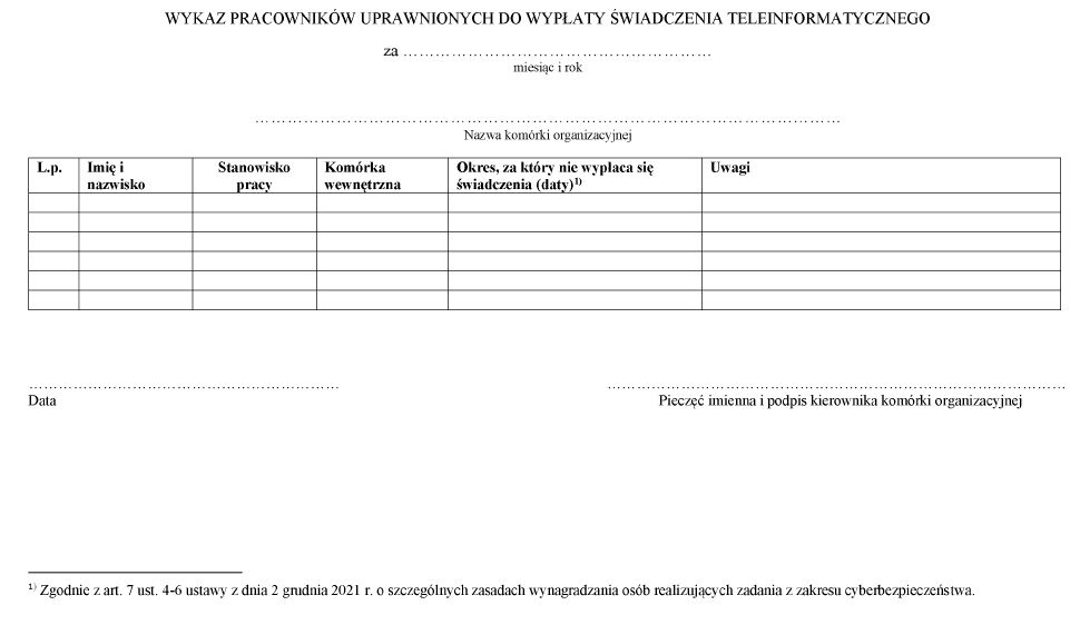 § 5. 1. W celu wypłaty świadczenia teleinformatycznego kierownik komórki organizacyjnej w terminie do 3. dnia miesiąca następującego po miesiącu, za który przysługuje świadczenie teleinformatyczne - sporządza wykaz podległych pracowników uprawnionych do wypłaty świadczenia teleinformatycznego, zgodnie z wzorem określonym w załączniku nr 5.