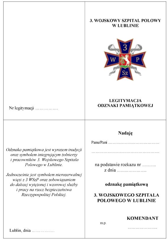 1) odznakę pamiątkową, zwaną dalej „odznaką”, 3. Wojskowego Szpitala Polowego w Lublinie, zwanego dalej „3 WSzP”;