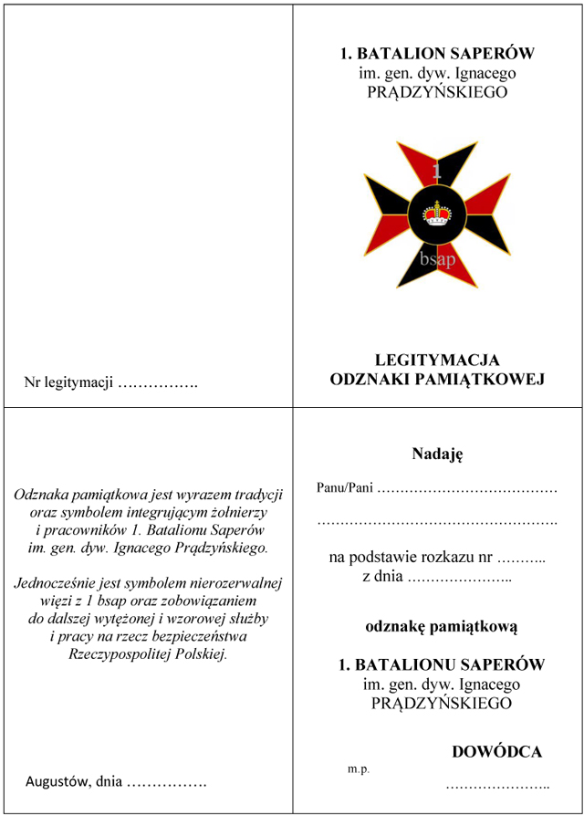 WZÓR LEGITYMACJI ODZNAKI PAMIĄTKOWEJ 1. BATALIONU SAPERÓW IM. GEN. DYW. IGNACEGO PRĄDZYŃSKIEGO 15. GIŻYCKIEJ BRYGADY ZMECHANIZOWANEJ IM. ZAWISZY CZARNEGO