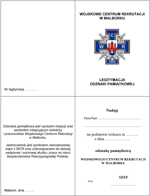 WZÓR LEGITYMACJI ODZNAKI PAMIĄTKOWEJ WOJSKOWEGO CENTRUM REKRUTACJI W MALBORKU