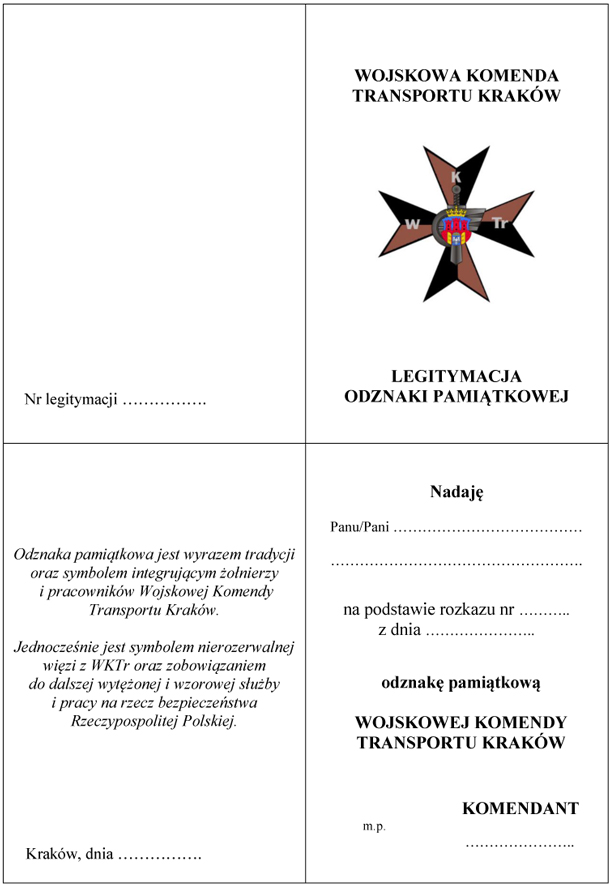 1) odznakę pamiątkową, zwaną dalej „odznaką”, Wojskowej Komendy Transportu Kraków, zwanej dalej „WKTr”;