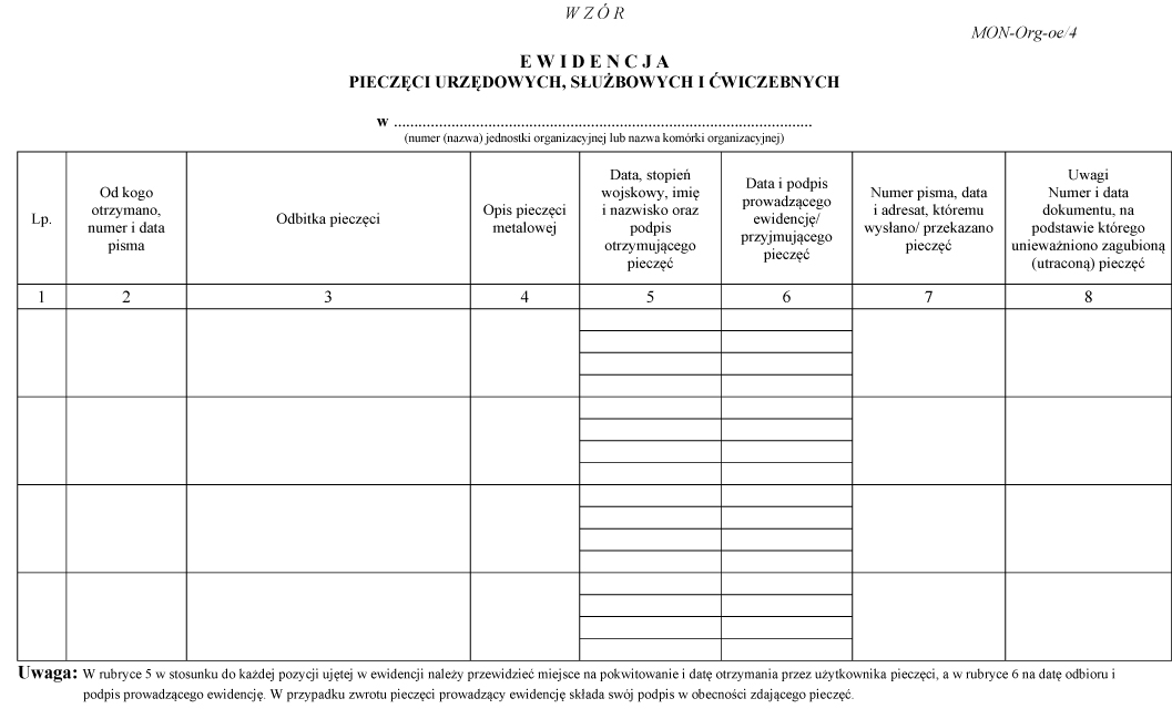 „1) ewidencji wszystkich pieczęci urzędowych, służbowych i ćwiczebnych w jednostce lub komórce organizacyjnej – według wzoru określonego w załączniku Nr 4 (druk MON-Org-oe/4);