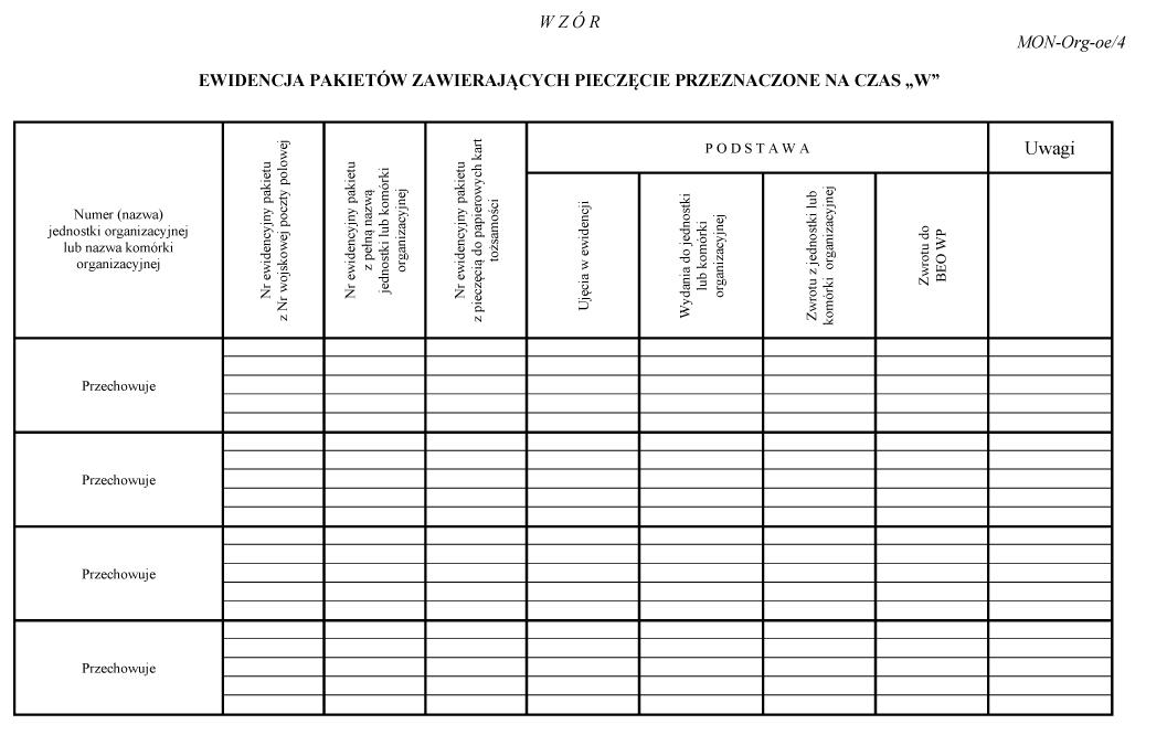 2) ewidencji pakietów zawierających pieczęcie na czas „W” – według wzoru określonego w załączniku Nr 5 (druk MON-Org-oe/4);”;