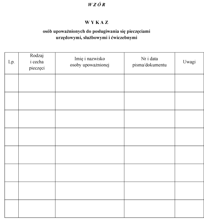 WZÓR - WYKAZ OSÓB UPOWAŻNIONYCH DO POSŁUGIWANIA SIĘ PIECZĘCIAMI URZĘDOWYMI, SŁUŻBOWYMI I ĆWICZEBNYMI