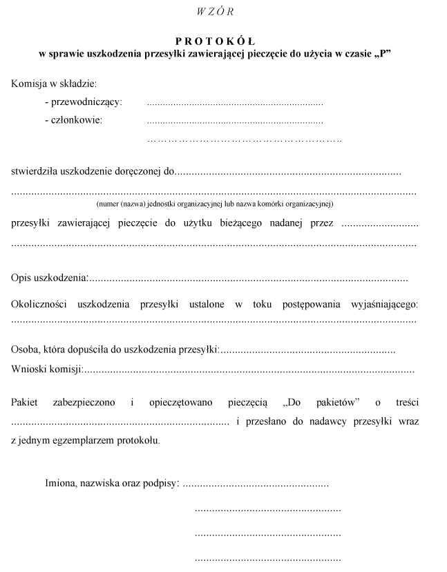 WZÓR - PROTOKÓŁ W SPRAWIE USZKODZENIA PRZESYŁKI ZAWIERAJĄCEJ PIECZĘCIE DO UŻYCIA W CZASIE „P”
