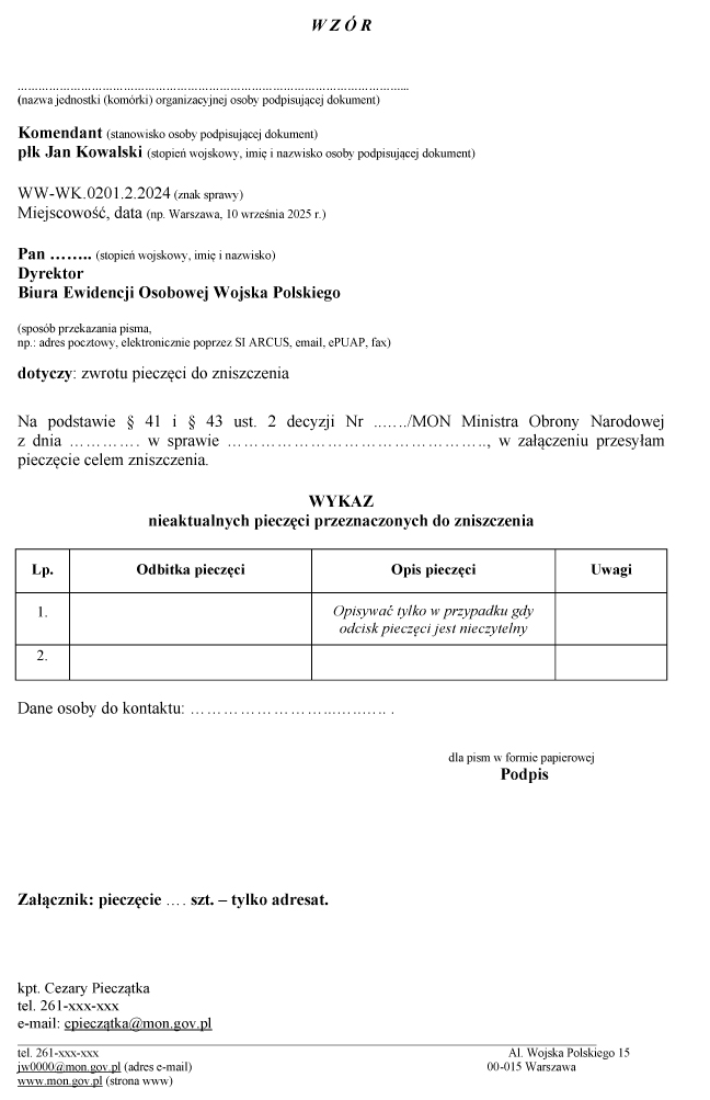„2. Kierownik jednostki lub komórki organizacyjnej na ewidencji, której znajduje się utracona pieczęć unieważnia ją i powiadamia o tym (w formie zawiadomienia) Dyrektora Biura Ewidencji Osobowej Wojska Polskiego.”;
