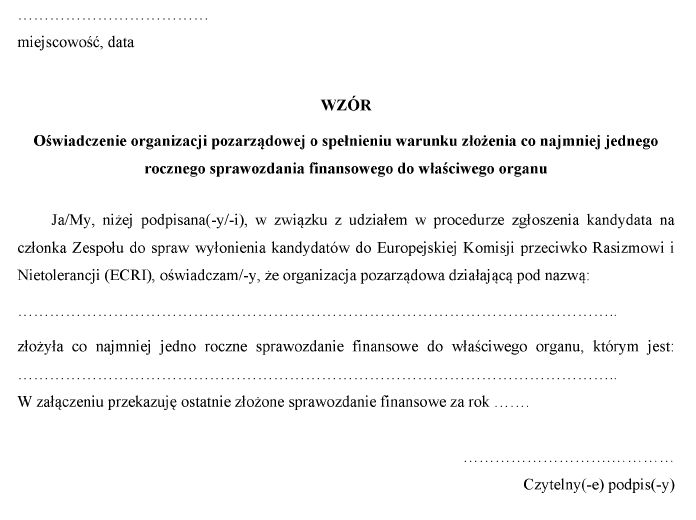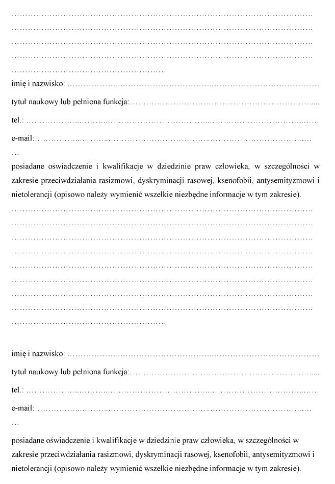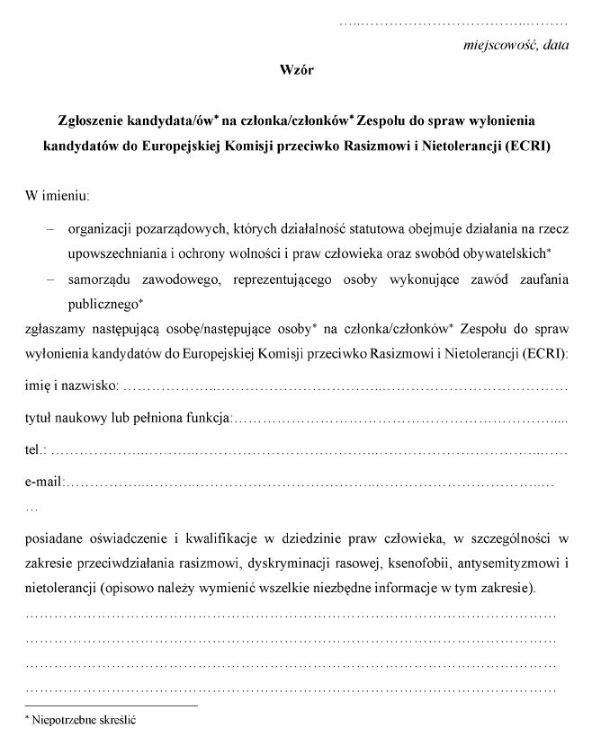 WZÓR - ZGŁOSZENIE KANDYDATA/ÓW NA CZŁONKA/CZŁONKÓW ZESPOŁU DO SPRAW WYŁONIENIA KANDYDATÓW DO EUROPEJSKIEJ KOMISJI PRZECIWKO RASIZMOWI I NIETOLERANCJI (ECRI)