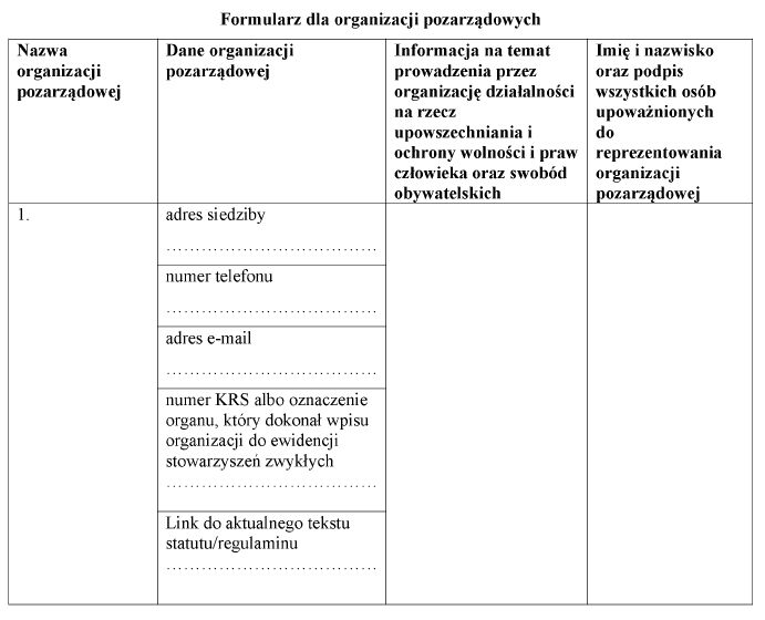 1) wspólnego zgłoszenia przez co najmniej 5 organizacji pozarządowych, których działalność statutowa obejmuje działania na rzecz upowszechniania i ochrony wolności i praw człowieka oraz swobód obywatelskich, i które złożyły co najmniej jedno roczne sprawozdanie finansowe do właściwego organu, lub