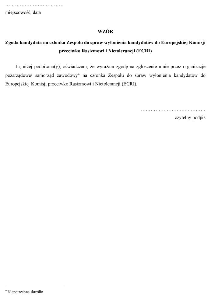 WZÓR - ZGODA KANDYDATA NA CZŁONKA ZESPOŁU DO SPRAW WYŁONIENIA KANDYDATÓW DO EUROPEJSKIEJ KOMISJI PRZECIWKO RASIZMOWI I NIETOLERANCJI (ECRI)