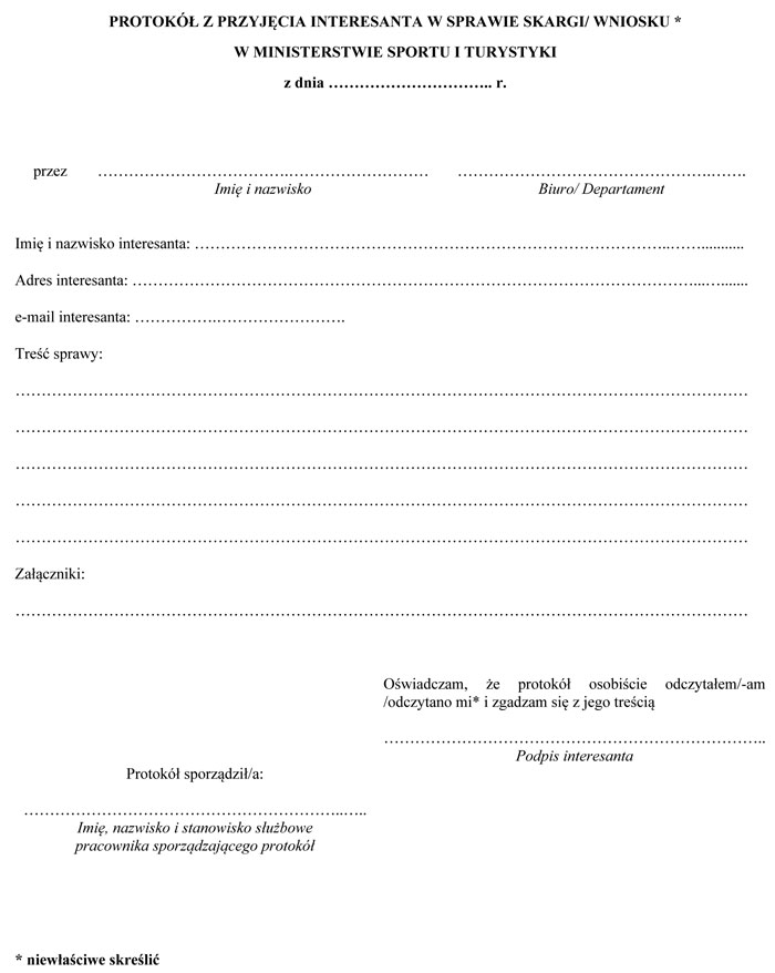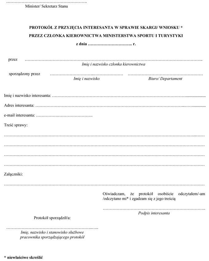 WZÓR - PROTOKÓŁ Z PRZYJĘCIA INTERESANTA W SPRAWIE SKARGI/ WNIOSKU PRZEZ CZŁONKA KIEROWNICTWA MINISTERSTWA SPORTU I TURYSTYKI