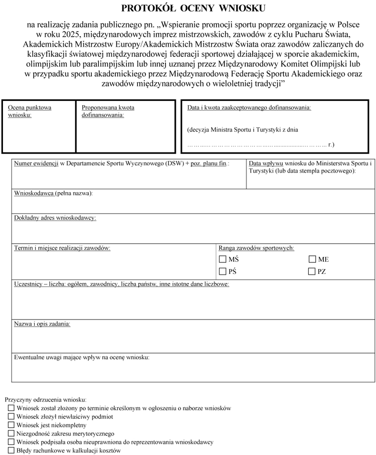 PROTOKÓŁ OCENY WNIOSKU NA REALIZACJĘ ZADANIA PUBLICZNEGO PN. „WSPIERANIE PROMOCJI SPORTU POPRZEZ ORGANIZACJĘ W POLSCE W ROKU 2025, MIĘDZYNARODOWYCH IMPREZ MISTRZOWSKICH, ZAWODÓW Z CYKLU PUCHARU ŚWIATA, AKADEMICKICH MISTRZOSTW EUROPY/AKADEMICKICH MISTRZOSTW ŚWIATA ORAZ ZAWODÓW ZALICZANYCH DO KLASYFIKACJI ŚWIATOWEJ MIĘDZYNARODOWEJ FEDERACJI SPORTOWEJ DZIAŁAJĄCEJ W SPORCIE AKADEMICKIM, OLIMPIJSKIM LUB PARALIMPIJSKIM LUB INNEJ UZNANEJ PRZEZ MIĘDZYNARODOWY KOMITET OLIMPIJSKI LUB W PRZYPADKU SPORTU AKADEMICKIEGO PRZEZ MIĘDZYNARODOWĄ FEDERACJĘ SPORTU AKADEMICKIEGO ORAZ ZAWODÓW MIĘDZYNARODOWYCH O WIELOLETNIEJ TRADYCJI”