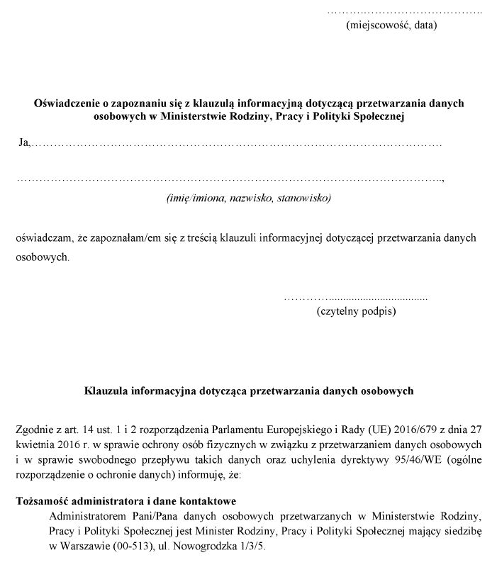 WZÓR - OŚWIADCZENIE O ZAPOZNANIU SIĘ Z KLAUZULĄ INFORMACYJNĄ DOTYCZĄCĄ PRZETWARZANIA DANYCH OSOBOWYCH W MINISTERSTWIE RODZINY, PRACY I POLITYKI SPOŁECZNEJ