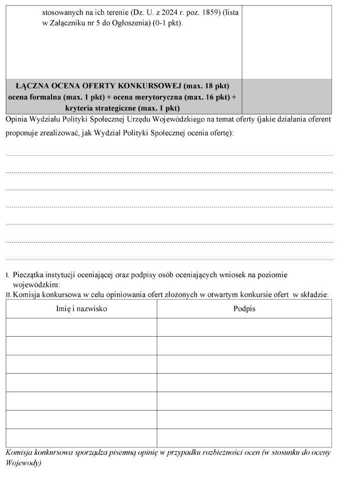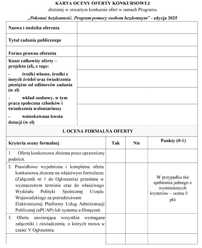 7. Członkowie Komisji oceniający złożone oferty wypełniają kartę oceny oferty „Pokonać bezdomność. Program pomocy osobom bezdomnym” - edycja 2025, zwaną dalej „kartą oceny oferty”. Wzór karty oceny oferty stanowi załącznik nr 5 do zarządzenia.
