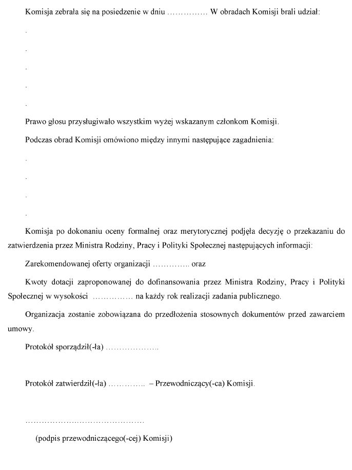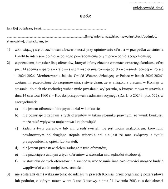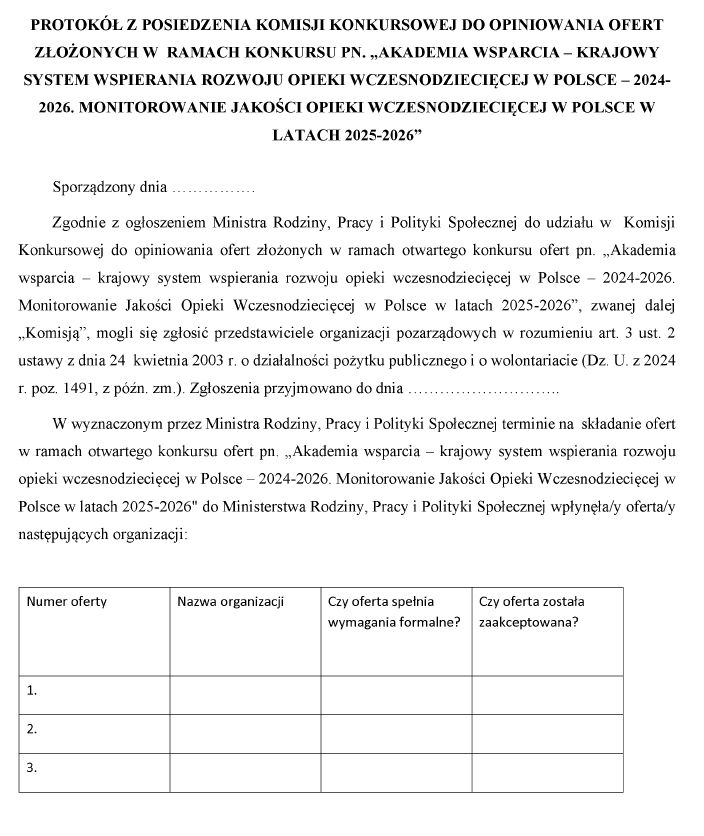 WZÓR - PROTOKÓŁ Z POSIEDZENIA KOMISJI KONKURSOWEJ DO OPINIOWANIA OFERT ZŁOŻONYCH W RAMACH KONKURSU PN. „AKADEMIA WSPARCIA - KRAJOWY SYSTEM WSPIERANIA ROZWOJU OPIEKI WCZESNODZIECIĘCEJ W POLSCE - 2024-2026. MONITOROWANIE JAKOŚCI OPIEKI WCZESNODZIECIĘCEJ W POLSCE W LATACH 2025-2026”