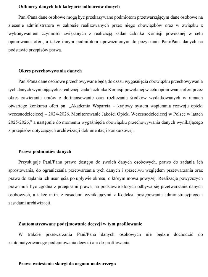 Regulamin Komisji Konkursowej do opiniowania ofert złożonych w ramach otwartego konkursu ofert pn. „Akademia Wsparcia - krajowy system wspierania rozwoju opieki wczesnodziecięcej w Polsce - 2024-2026. Monitorowanie Jakości Opieki Wczesnodziecięcej w Polsce w latach 2025-2026”