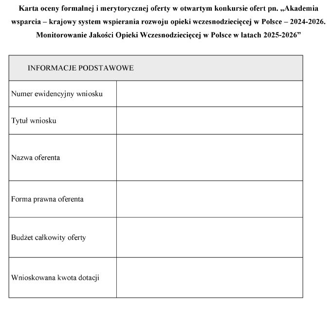 WZÓR - KARTA OCENY FORMALNEJ I MERYTORYCZNEJ OFERTY W OTWARTYM KONKURSIE OFERT PN. „AKADEMIA WSPARCIA - KRAJOWY SYSTEM WSPIERANIA ROZWOJU OPIEKI WCZESNODZIECIĘCEJ W POLSCE - 2024-2026